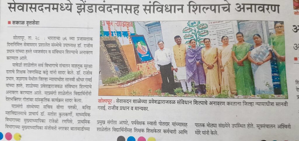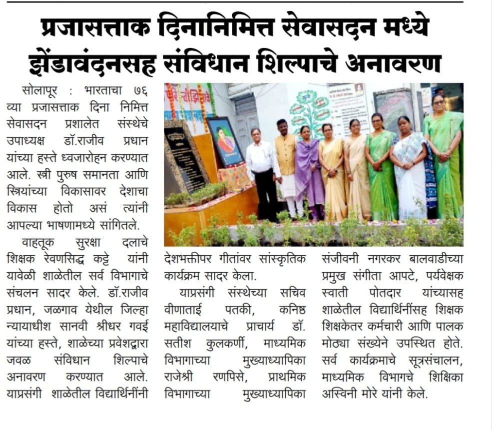 भारताचा ७६ वा प्रजासत्ताक दिना निमित्त सेवासदन प्रशालेत संस्थेचे उपाध्यक्ष डॉ. राजीव प्रधान यांच्या हस्ते ध्वजारोहन करण्यात आले. स्त्री पुरुष समानता आणि स्त्रियांच्या विकासावर देशाचा विकास होतो असं त्यांनी आपल्या भाषणामध्ये सांगितले.