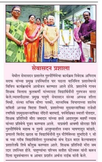 सेवासदन प्रशालेत गुरुपौर्णिमेचा कार्यक्रम निवेदक अभिराम सराफ यांच्या प्रमुख उपस्थितीत पार पडला यानिमित्त प्रशालेमध्ये विविध कार्यक्रमांचे आयोजन करण्यात आले होते. प्रशालेचे गायन शिक्षक विलास कुलकर्णी यांच्यासह विद्यार्थिनींनी गुरुभजन सादर केले. व्यासपीठावर प्रमुख पाहुणे सेवासदन संस्था अध्यक्ष शीला मिस्त्री, संस्था सचिव वीणा पतकी, माध्यमिक विभागाच्या शालेय समिती अध्यक्ष विदया लिमये, प्रशालेच्या मुख्याध्यापिका राजेश्री रणपिसे उपमुख्याध्यापिका नंदिनी बारभाई, पर्यवेक्षिका स्वाती पोतदार, शिक्षक प्रतिनिधी मीरा जमादार यांच्या हस्ते आदयगुरू महर्षी व्यास यांच्या प्रतिमेचे पूजन करण्यात आले. याप्रसंगी श्रावणी सोनाग्रा हिने गुरुपौर्णिमेचे महत्त्व व गुरुचे आयुष्यातील स्थान भाषणातून मांडले, प्रणाली विनोद खरात या विद्यार्थिनींनी गुरु पौर्णिमेच्या शुभदिनी ९ वी क च्या गरीब विद्यार्थिनीला पुस्तकांचा संच देऊन मदत केल्याबद्दल प्रशालेतर्फे तिचे कौतुक करण्यात आले. शिक्षक प्रतिनिधी मीरा जम ादार उपस्थित होते. पाहुण्यांचा परिचय सतीश घंटेनवरू यांनी करून दिला सूत्रसंचालन व आभार प्रदर्शन अर्चना नाईक यांनी केले.